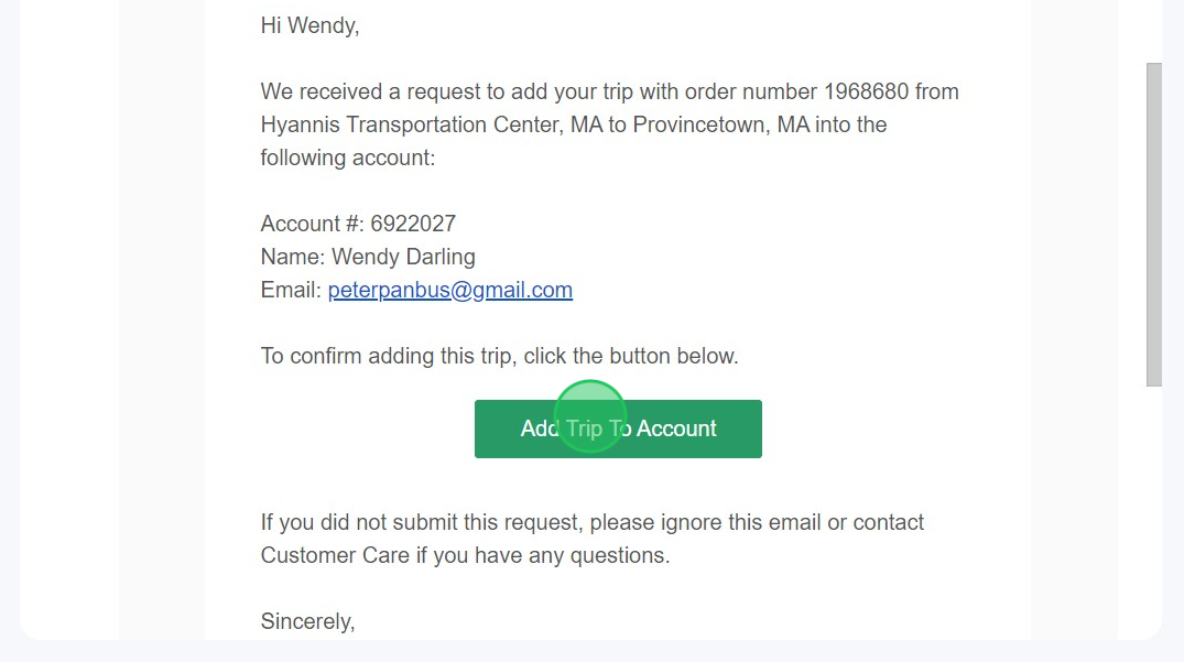 8. Navigate to your email and find the email titled "Add your reservation!" then click "Add Trip To Account".