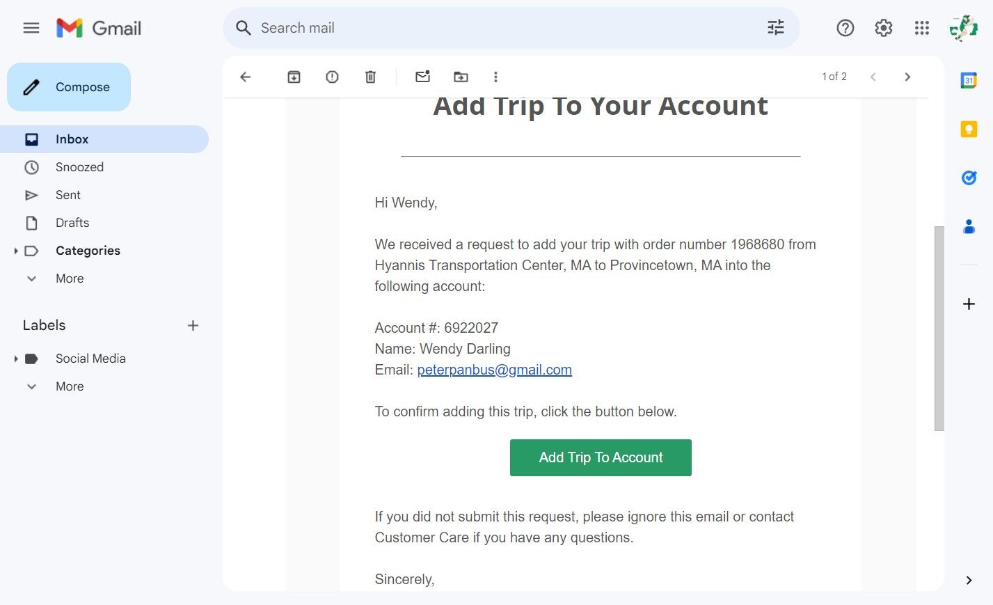 8. Navigate to your email and find the email titled "Add your reservation!" then click "Add Trip To Account".