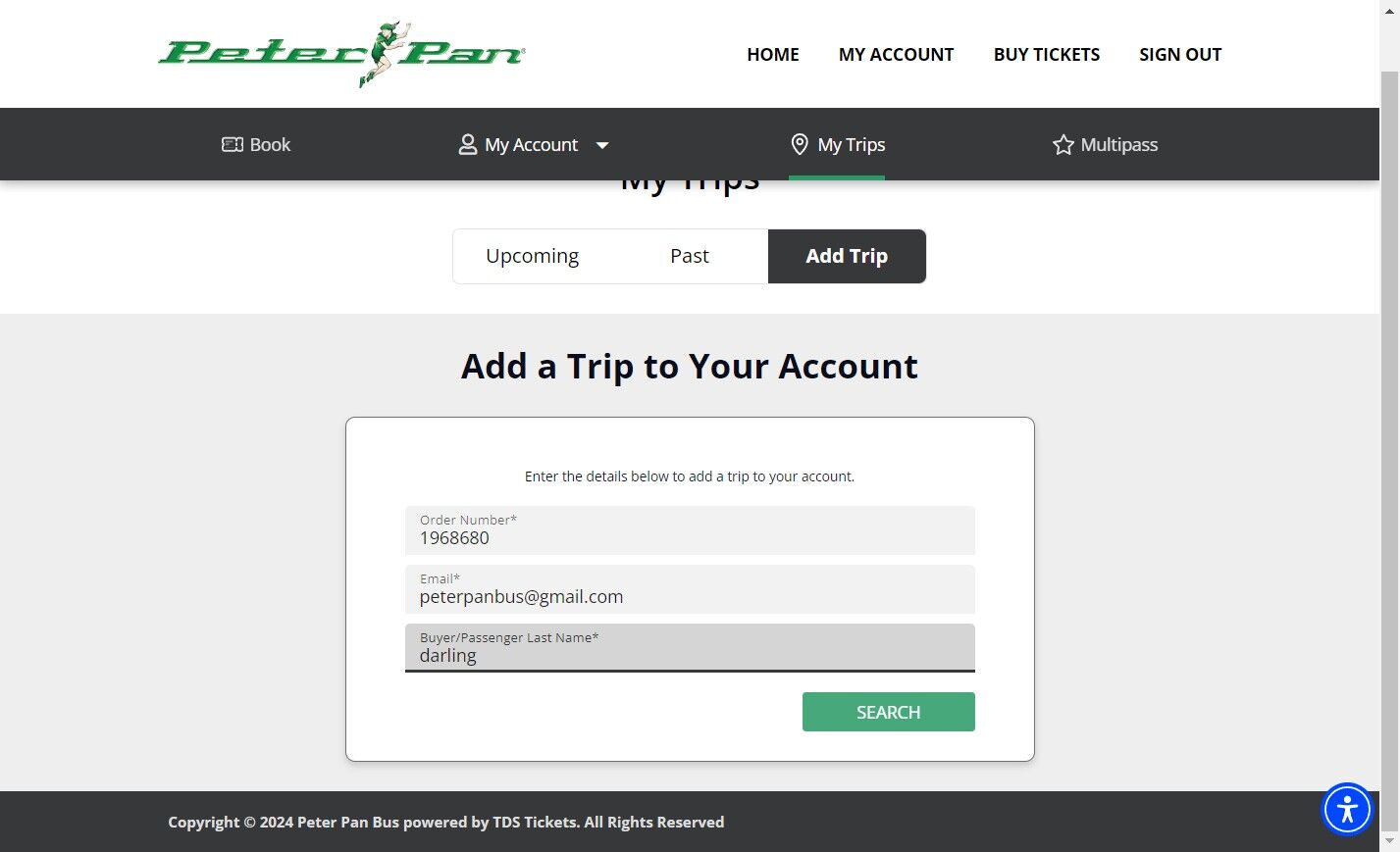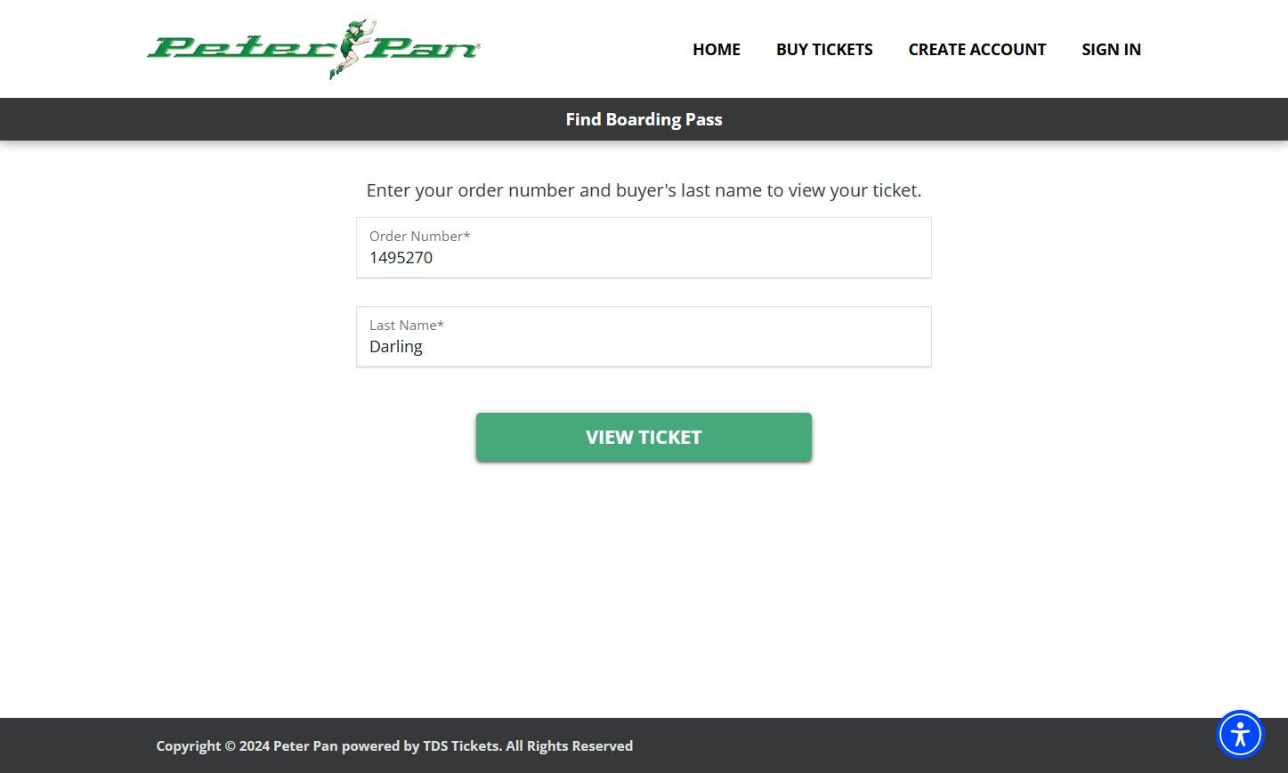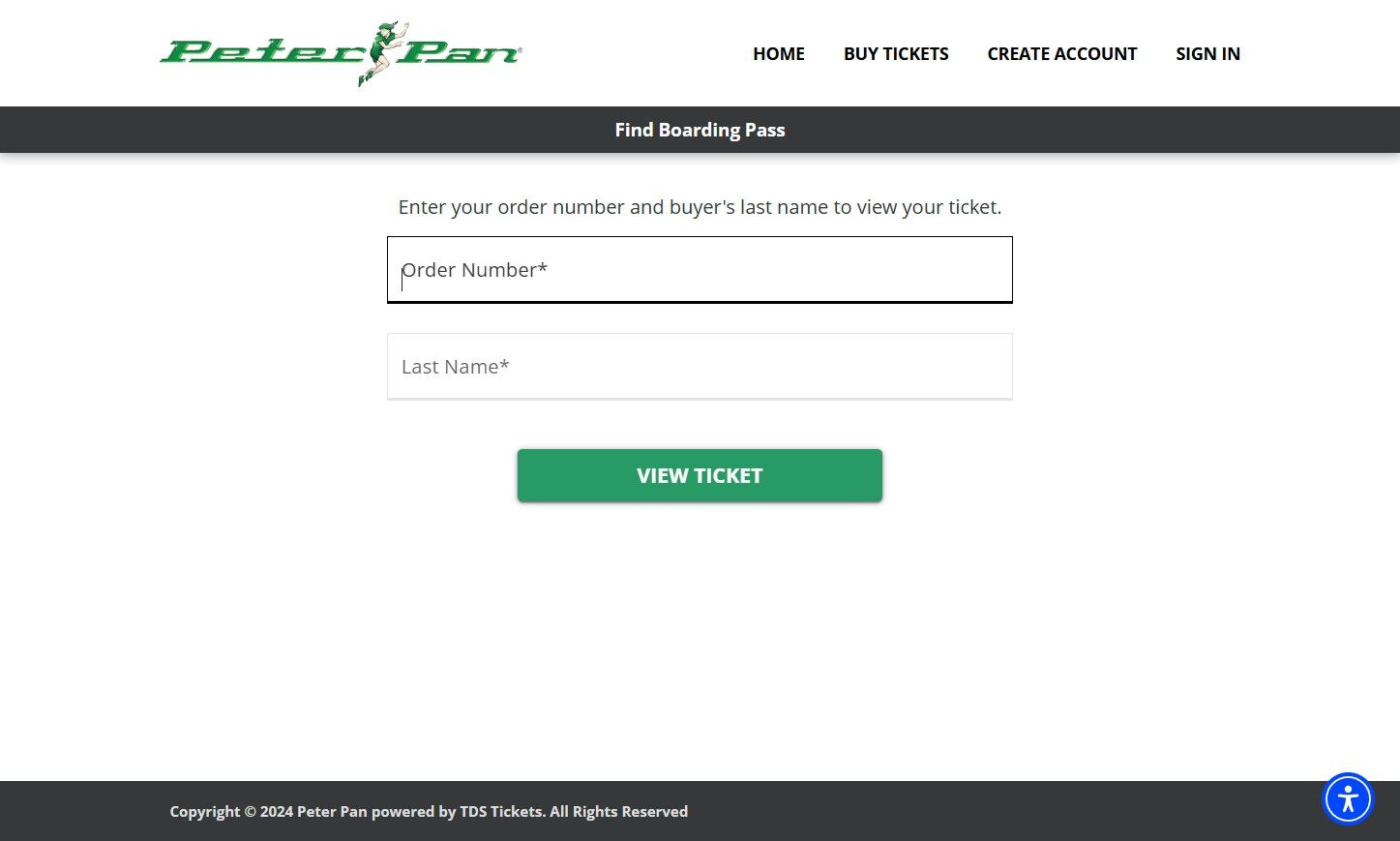 6. Enter your order number, the email associated with the ticket purchase, and the last name of the buyer or passenger.